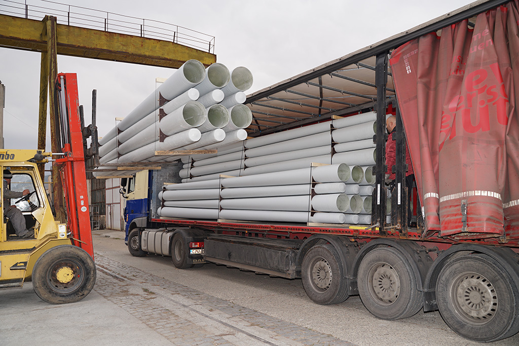 Asemenea încărcătură în care se introduc media a 150 de stâlpi din fibră de sticlă reduc costurile cu circa 10 transpoarte cu stâlpi din beton. Având interiorul gol, pot fi introduși unul în altul 2, 3, 4 buc.